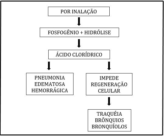 Irritação das vias respiratórias (traquéia, brônquios, lobos pulmonares) seguido de dispnéia, queimação da garganta, aperto e opressão torácica, cianose, edema agudo do pulmão e óbito por insuficiência cardiorrespiratória. Cronicamente e como sequelas ocasiona enfisema pulmonar, bronquiectasias e corpulmonale.