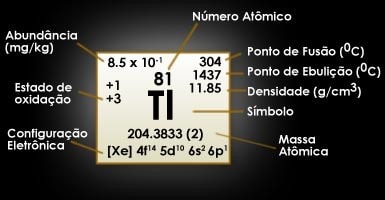 Metal branco azulado; muito macio e facilmente fundível; densidade 11,85; ponto de fusão 303,5°C; temperatura de ebulição a 1457°C; volatiliza por volta de 174°C; oxida no ar formando uma camada revestidora de óxido de tálio, T12O; reage com os ácidos sulfúrico e nítrico.